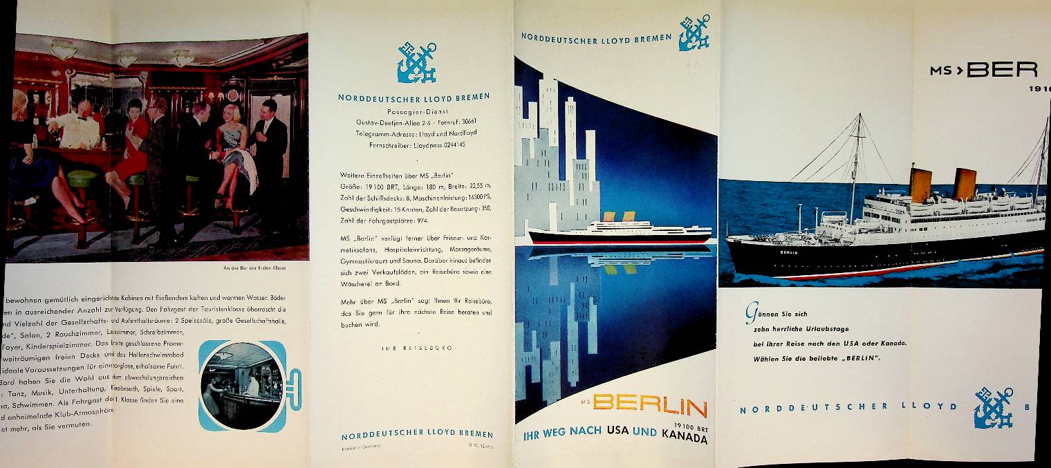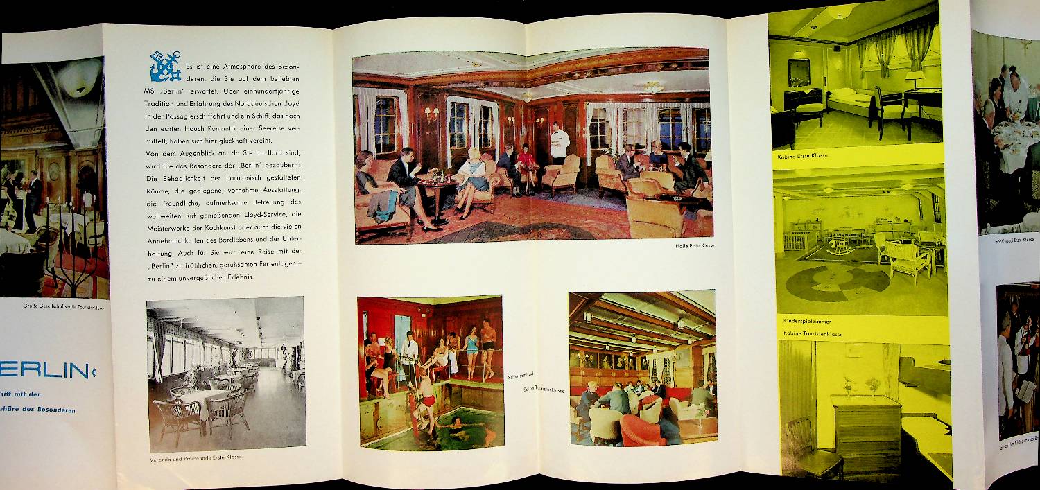 NDL: Ca. 1958 Germany, softcover folding-out 11 pages, with many photos of the ship and her interior. In very good condition