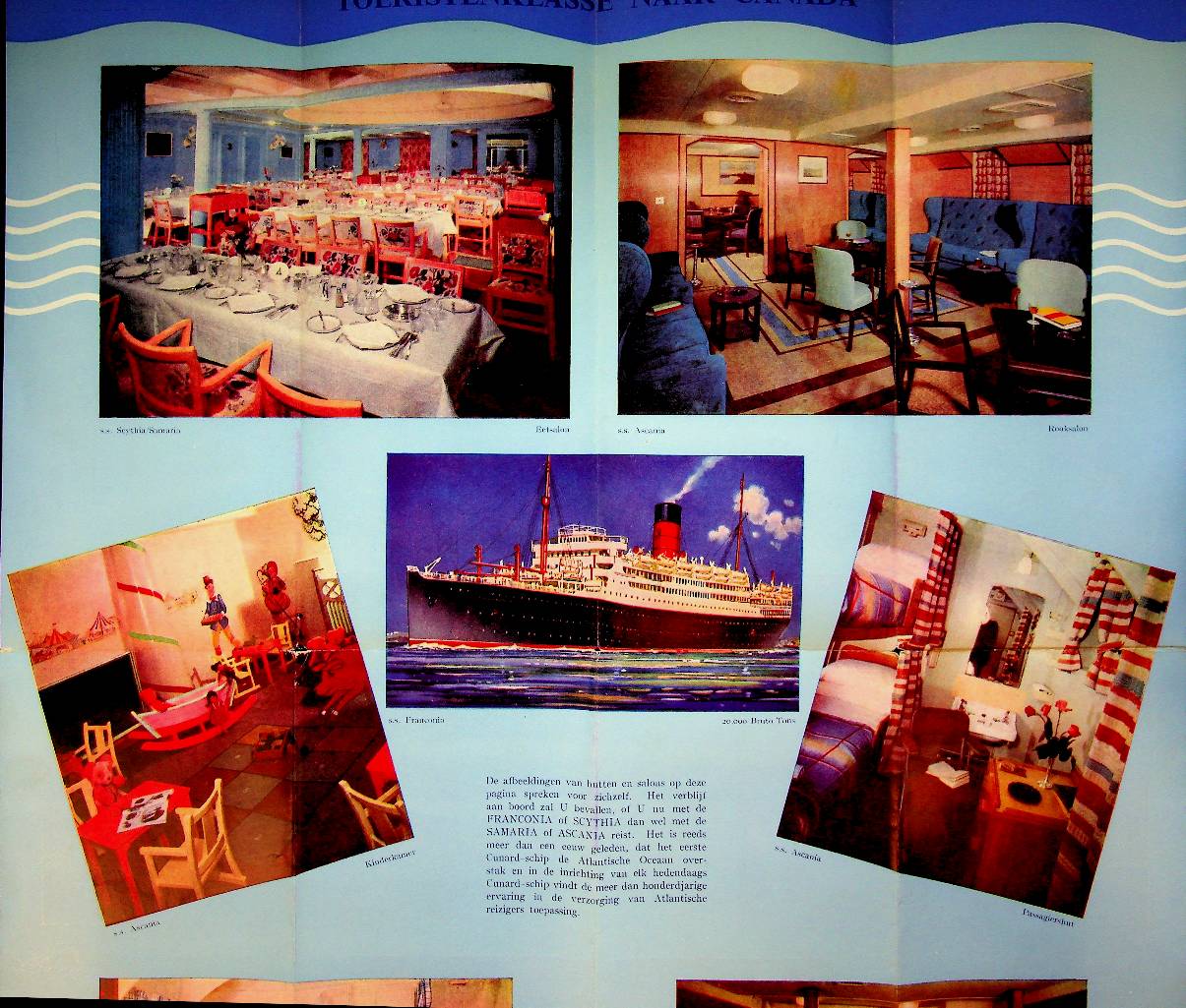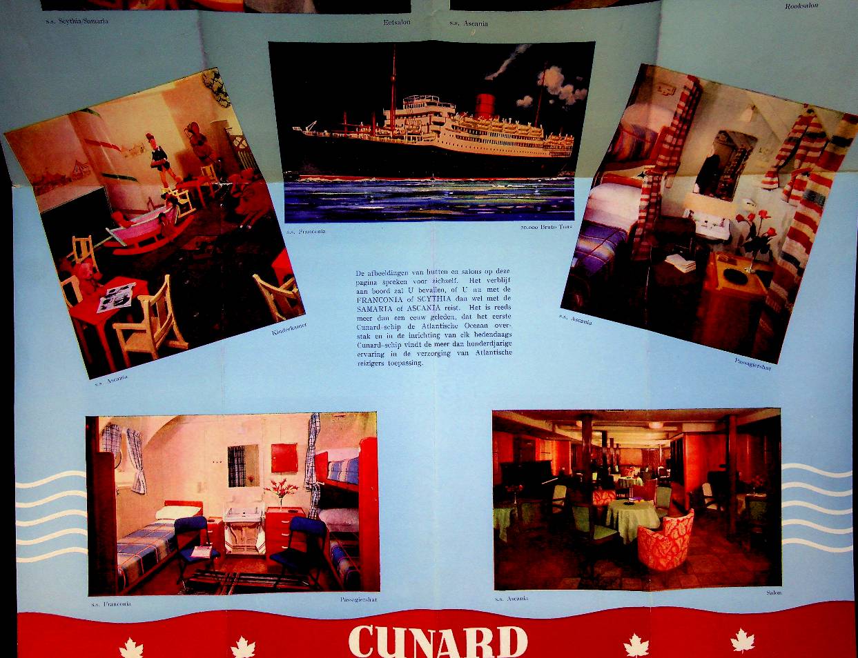 Cunard: ca. 1955 UK, softcover folding-out, with photos of interiors of the liners like Ascania, Franconia and Scythia. In very good condition. Dutch Language