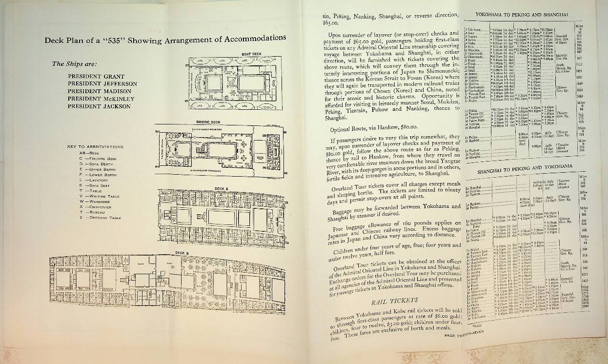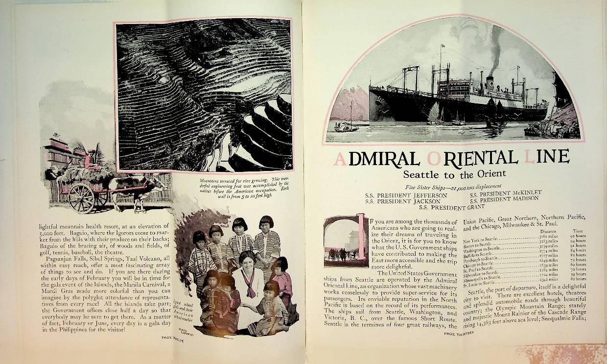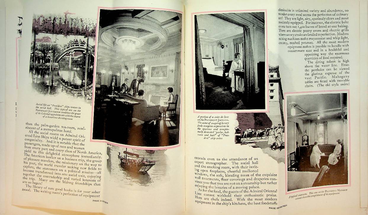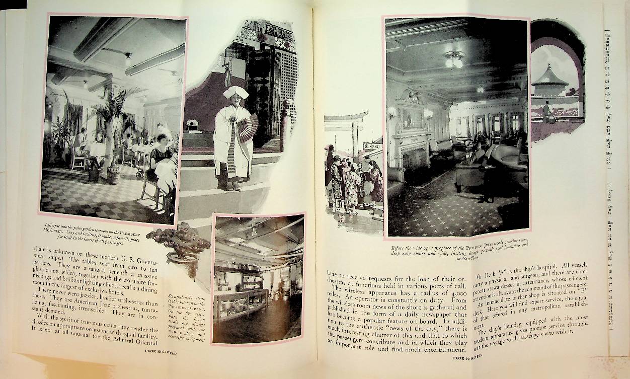Collective: 1923 Seattle, softcover, 29 pages, with photos of the travel and photos of the interior of the ships, like the President Jefferson, McKinley, Madison etc. Also route maps and information. Brochure in very good condition