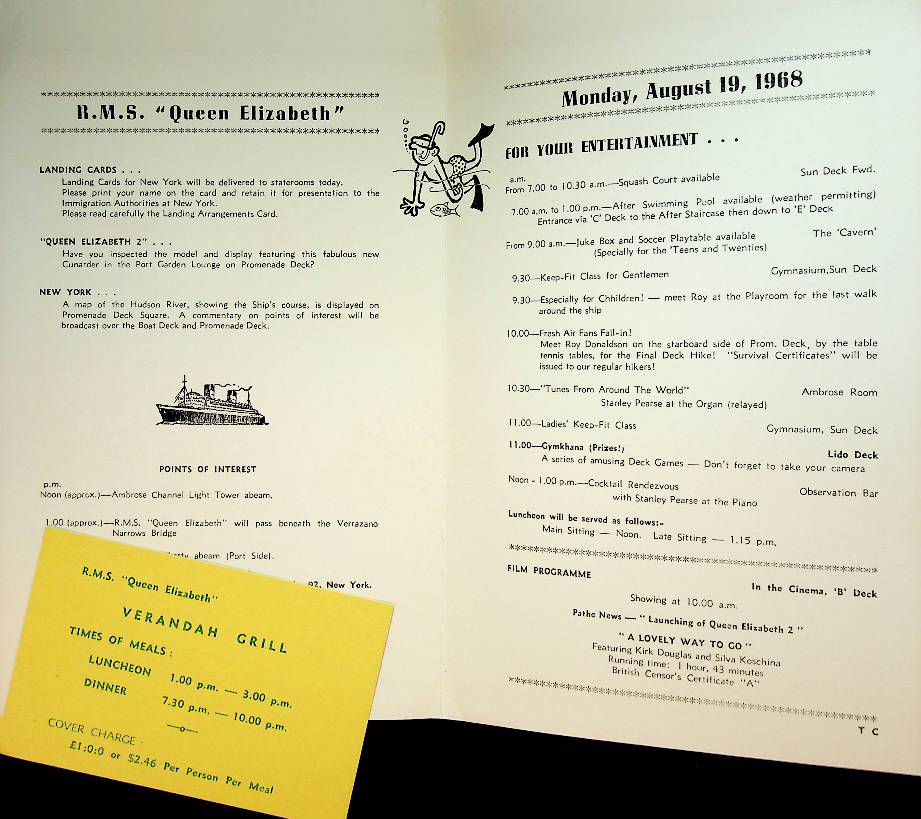R.M.S. Queen Elizabeth, programme of today, 1968