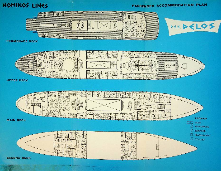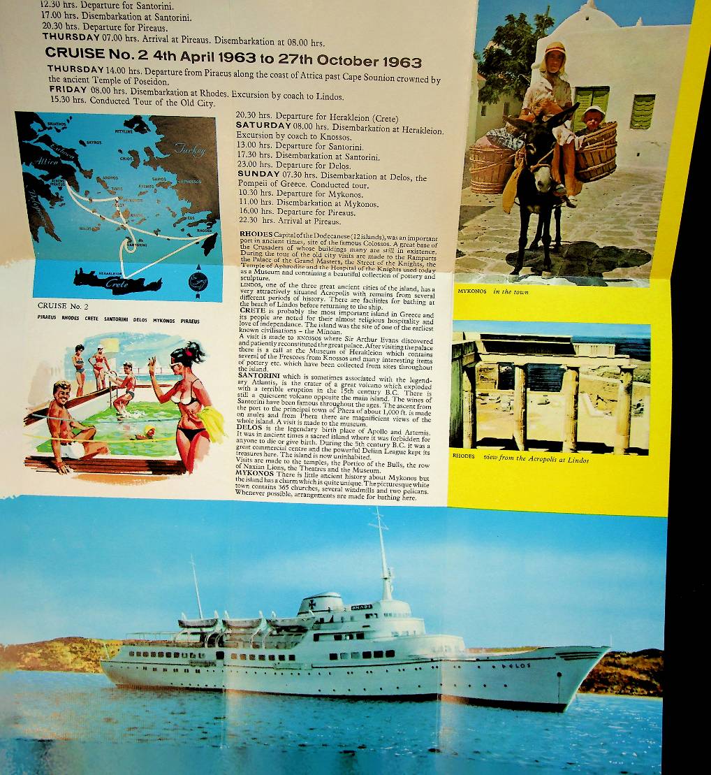 Nomikos Lines: Delos Cruises 1963, softcover folding-out, 10 pages, with photo of ss Delos and her deckplan. In very good condition